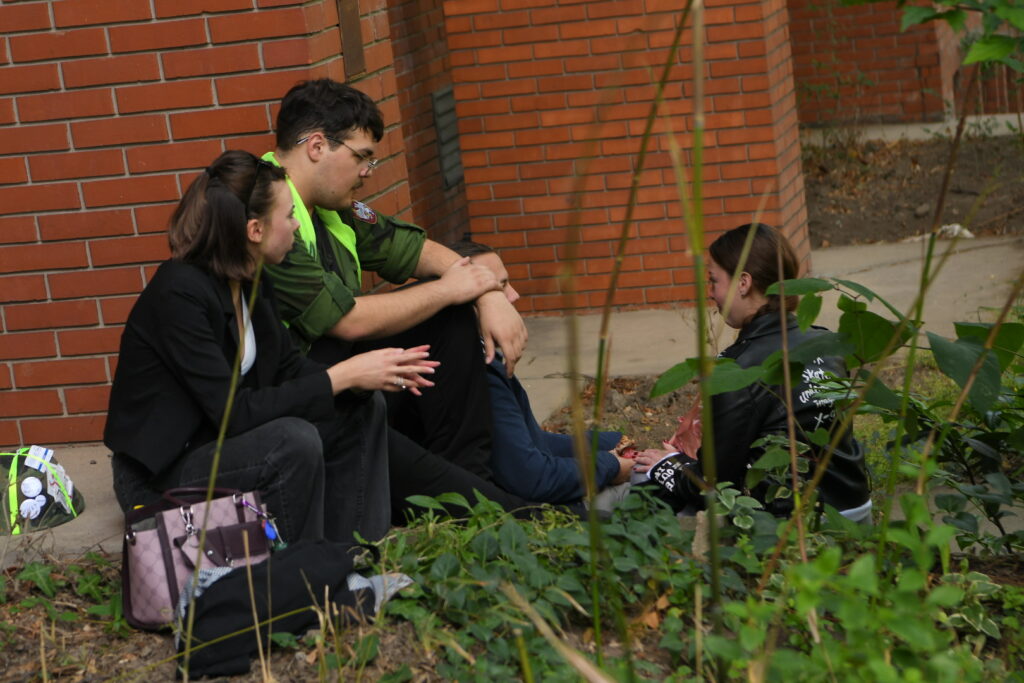 Ispred suda je mirno, studenti se igraju loptom, druže se, pušta se muzika.