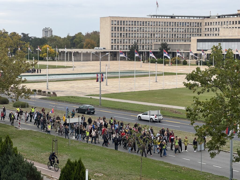 Prosvetni radnici, studenti, roditelji i građani koji ih podržavaju i dalje se okupljaju kod kružnog toka kod Ušća, noseći transparente i poruke solidarnosti, dok se atmosfera polako pretvara u veliki skup za odbranu prava i sloboda u prosveti.