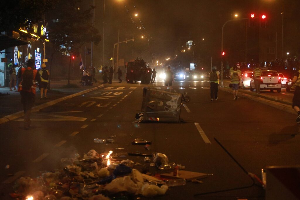 Nekoliko kontejnera, najmanje četiri, je prevrnuto i zapaljeno, a tu su i oborene žardinjere i kamene kante za smeće.