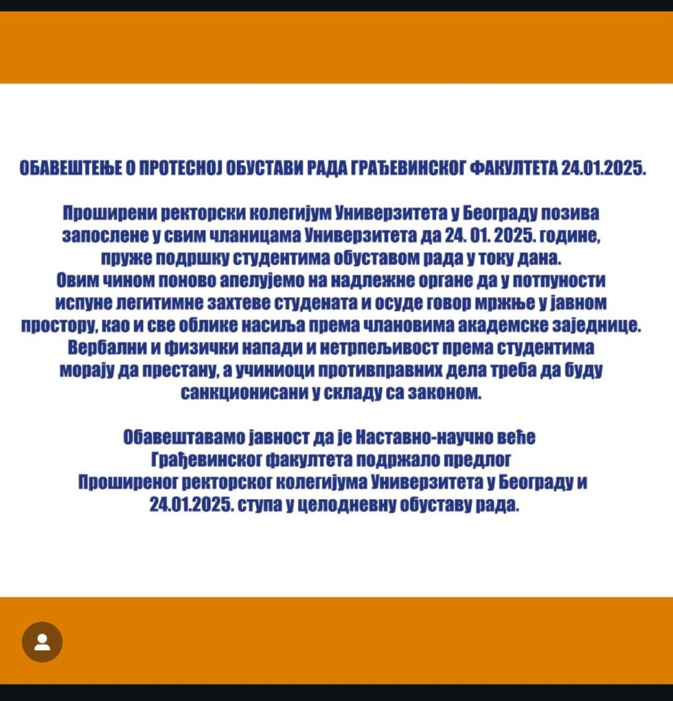 Roditelji đaka Osnovne škole "Filip Filipović" u Beogradu organizovali su danas skup podrške nastavnicima koji su 20. januara, na jedan dan, obustavili rad u toj obrazovnoj ustanovi i dali podršku studentima u blokadi Foto:FoNet/Marko Dragoslavić Roditelji đaka Osnovne škole "Filip Filipović" u Beogradu organizovali su danas skup podrške nastavnicima koji su 20. januara, na jedan dan, obustavili rad u toj obrazovnoj ustanovi i dali podršku studentima u blokadi Foto:FoNet/Marko Dragoslavić Roditelji đaka Osnovne škole "Filip Filipović" u Beogradu organizovali su danas skup podrške nastavnicima koji su 20. januara, na jedan dan, obustavili rad u toj obrazovnoj ustanovi i dali podršku studentima u blokadi Foto:FoNet/Marko Dragoslavić BLOG Sve više učesnika generalnog štrajka: Protesti u gradovima širom Srbije, nastavljaju se pritisci na nastavnike autor: Nova.rs Društvo 23. jan. 2025. 10:42 > 23. jan. 2025. 21:01 0 Podeli vest: Četvrti je dan otkako je deo prosvetara obustavio rad. Njima su podršku pružili i roditelji. Nastavnici su pružili podršku studentskim zahtevima, ali su i iskazali nezadovoljstvo zbog položaja u kom se nalaze, kao i nezadovoljstvo zbog pregovora predstavnika reprezentativnih sindikata sa predstavnicima vlasti. Podeli vest: Oglas RAZVOJ DOGAĐAJA 59 Objava pre {hours}h pre {minutes} min. 23.01. 20:55 Protestovali prosvetni radnici i građani Arilja Veliki broj Ariljaca okupio se večeras u ovoj opštini kako bi i oni poslali podršku studentima, prosvetnim radnicima i svima onima koji žele život u pravnoj državi u kojoj sve institucije rade svoj posao i zakoni podjednako važe za sve. Podrška studetima i prosvetnim radnicima stiže iz Arilja Foto:Slavko Joksimović | Podrška studetima i prosvetnim radnicima stiže iz Arilja Foto:Slavko Joksimović 23.01. 20:53 Održani protesti u Negotinu i Jagodini Negotin večeras! Više ljudi nego 2000. u šetnjama, čiji sam bio svedok! pic.twitter.com/SFFdCYR3Zg— Stojan Šljivić (@RadisaMilosevi1) January 23, 2025 **** Jagodina večeras. Dovoljno nas je. Niste dobrodošli pic.twitter.com/b4fOWqd3HF— Čupava JAGODINKA (@Boing969) January 23, 2025 23.01. 20:52 Uz studente i Građevinski fakultet Privatna arhiva | Privatna arhiva 23.01. 20:25 Fakultet likovnih umetnosti uz studente View this post on Instagram A post shared by @flu_blokada 23.01. 19:49 Kokot: Sutra najmasovniji protest Prema podacima i anketama Nezavisnog sindikata prosvetnih radnika Srbije (SPRS), sutra više od 80 odsto u škola u većim gradovima neće raditi u punom kapacitetu, rekao je večeras FoNetu predsednik tog sindikata Dušan Kokot. "Ovako nikada nije bilo. Reč je o najmasovnijem protestu za koji ja znam, nikada nismo imali ovakve izlazne ankete, a ja radim u prosveti dužđe od 20 godina", kazao je Kokot. On je dodao da je sutra "Dan D" i da su se sve škole fokusirale na poziv koji je stigao od studenata da se sutra obustave sve aktivnosti. Kokot dodaje da se protestu škole priljučuju na dnevnom nivou i konstatuje da drugo polugodište nije počelo. Istakao je da ne zna odakle Ministarsvu prosvete podaci o tome da u Srbiji radi 97 odsto škola i konstatovao da se samo šetnom po bilo kom gradu može utvrditi da to nije istina. 23.01. 19:10 Protestna šetnja u Kraljevu u znak podrške Sonji, studentima i profesorima U Kraljevu se održava mirna protestna šetnja u znak podrške Sonji Ponjavić, kao i studentima i profesorima. Protestna šetnja u Kraljevu u znak podrške Sonji, kao i studentima i profesorima Foto:N1 | Protestna šetnja u Kraljevu u znak podrške Sonji, kao i studentima i profesorima Foto:N1 23.01. 18:17 Plenum učenika medicinske škole u Subotici se priključuje jednodnevnom štrajku Na plenumu učenika subotičke Srednje medicinske škole odlučeno je danas da će se đaci u petak, 24. januara priključiti jednodnevnoj obustavi rada. U obaveštenju koje su prosledili direktorki Srednje medicinske škole Nataliji Trbović Toljagić, navodi se da će svi razredi u petak biti u školi od 07.30 do 10.30, ali da neće imati nastavu i da će se nakon toga učenici uputiti ka centru grada kako bi se priključili studentima u blokadi. 23.01. 18:14 Rektorski kolegijum FPN pozvao na podršku studentima sutra View this post on Instagram A post shared by Fakultet političkih nauka, BU (@fpn_beograd) 23.01. 18:08 Rektor Univerziteta u Novom Sadu odložio sednicu na kojoj je trebalo da se glasa o njegovom razrešenju Rektor Univerziteta u Novom Sadu Dejan Madić još uvek nije sazvao sednicu Senata Univerziteta u Novom Sadu, iako je značajan broj fakulteta zahtevao njegovu ostavku,studenti u blokadi, kao i profesori na protestnom skupu organizovanom protekle subote, rečeno je novinarima u neformalnoj mreži Slobodan univerzitet, koju čine profesori. 23.01. 18:03 Ministarka prosvete: Tri odsto škola u blokadi, u 97 odsto ima nastave Ministarka prosvete Srbije Slavica Đukić Dejanović je danas rekla da je tri odsto škola u blokadi, dok u 97 odsto ima nastave i najavila da će se već ove nedelje izricati i pokretati postupci protiv onih koji krše zakon. studentske blokade Pratite nas na društvenim mrežama: Koje je tvoje mišljenje o ovoj temi? Učestvuj u diskusiji ili pročitaj komentare Budite prvi koji će ostaviti komentar Pošalji komentar Pročitaj komentare (0)