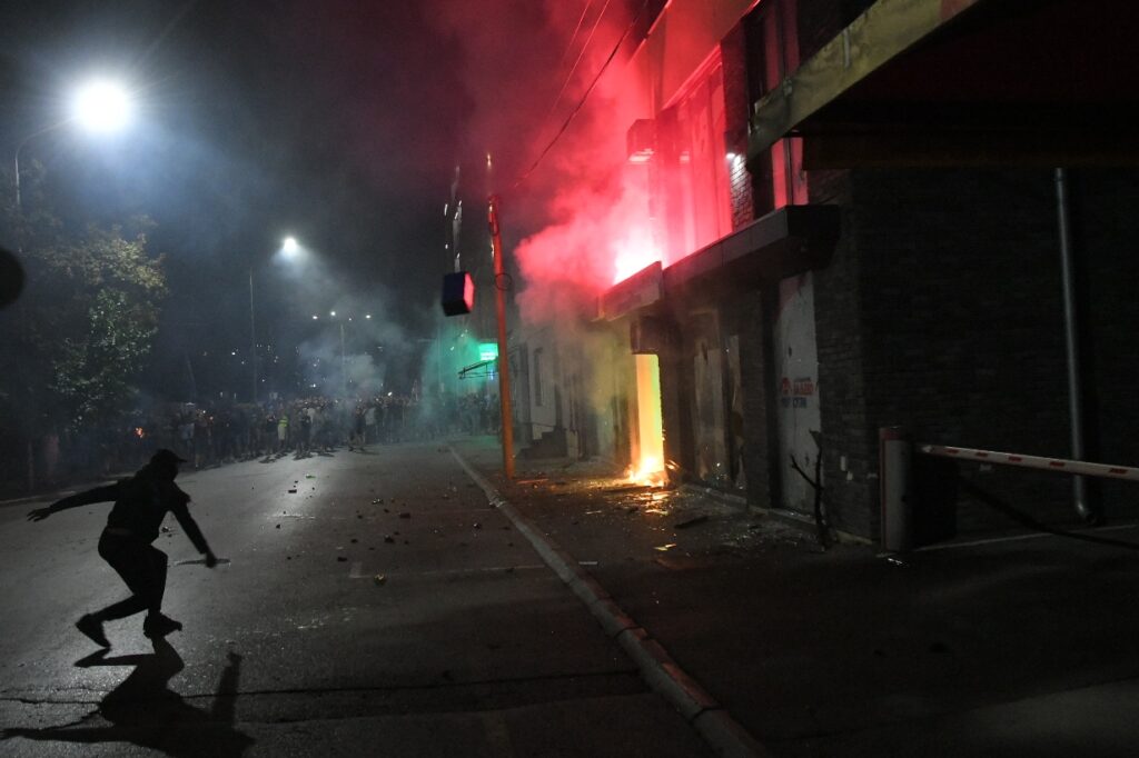 Oni bacaju kamenje i pirotehnička sredstva, a upaljena je i baklja koju je jedan mladić bacio u prostorije naprednjaka.