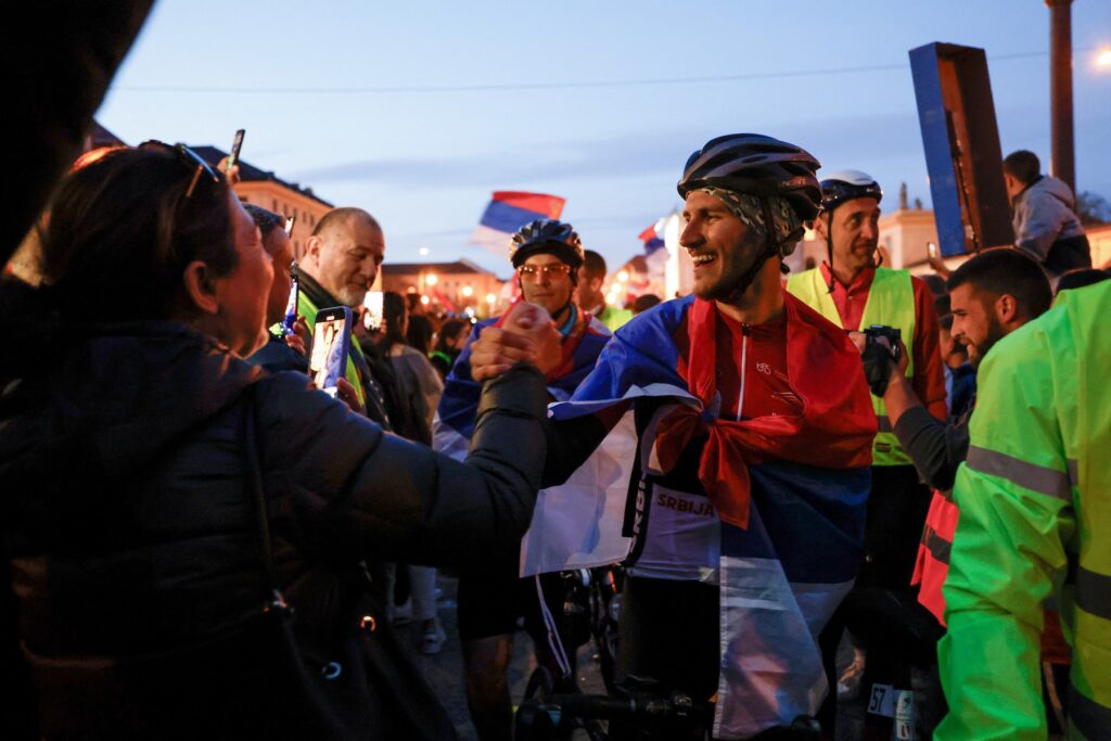 Studenti biciklisti su sa glavnog trga u Minhenu, gde je bio organizovan doček, stigli u srpsku pravoslavnu crkvu gde su dočekani sa pogačom i solju.