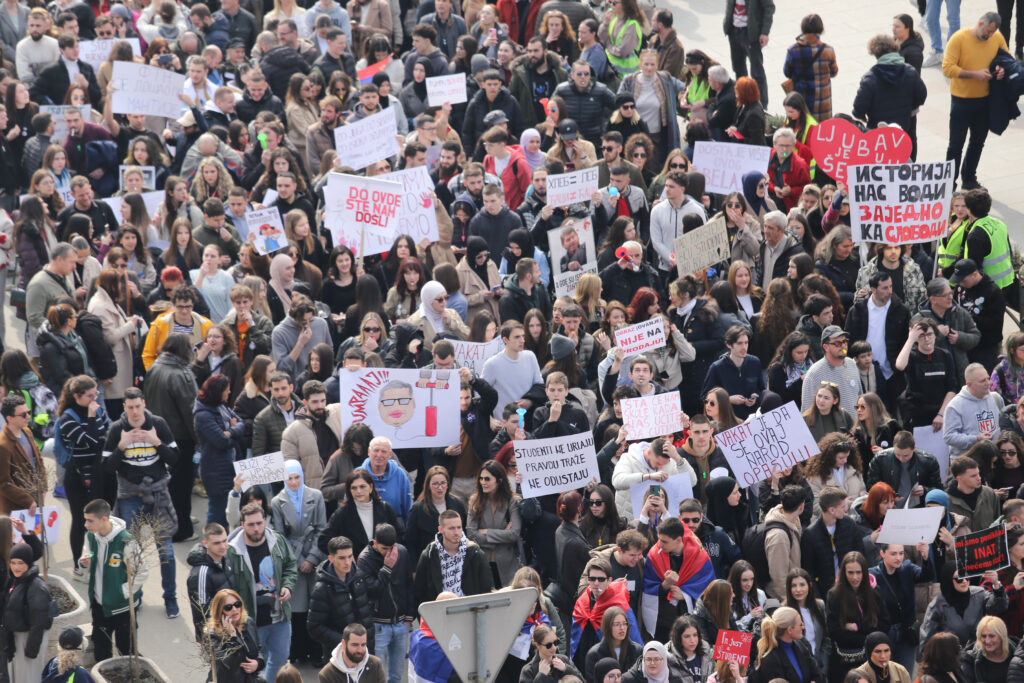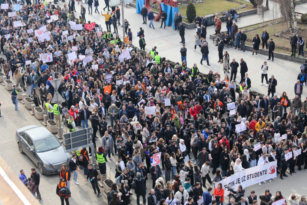Posle 16 minuta tišine u Novom Pazaru, okupljeni su nastavili šetnju od kružnog toka, šetalištem, prolaze pored zgrade BNV gde će blokirati raskrsnicu. Trube, uzvikuju "prinudna uprava da se uvede na univerzitet", prenosi N1.