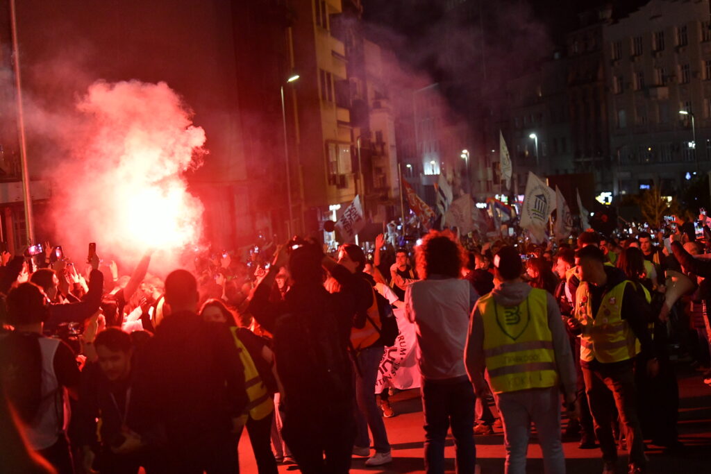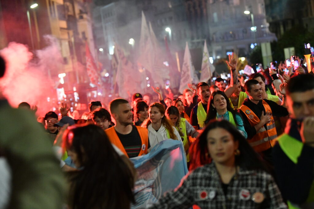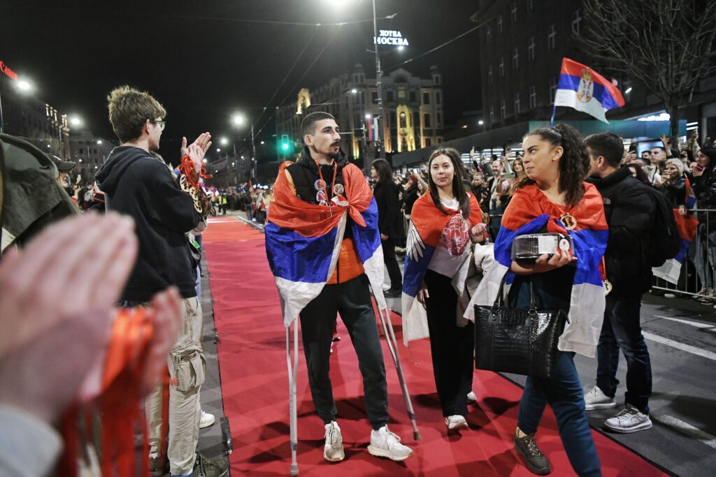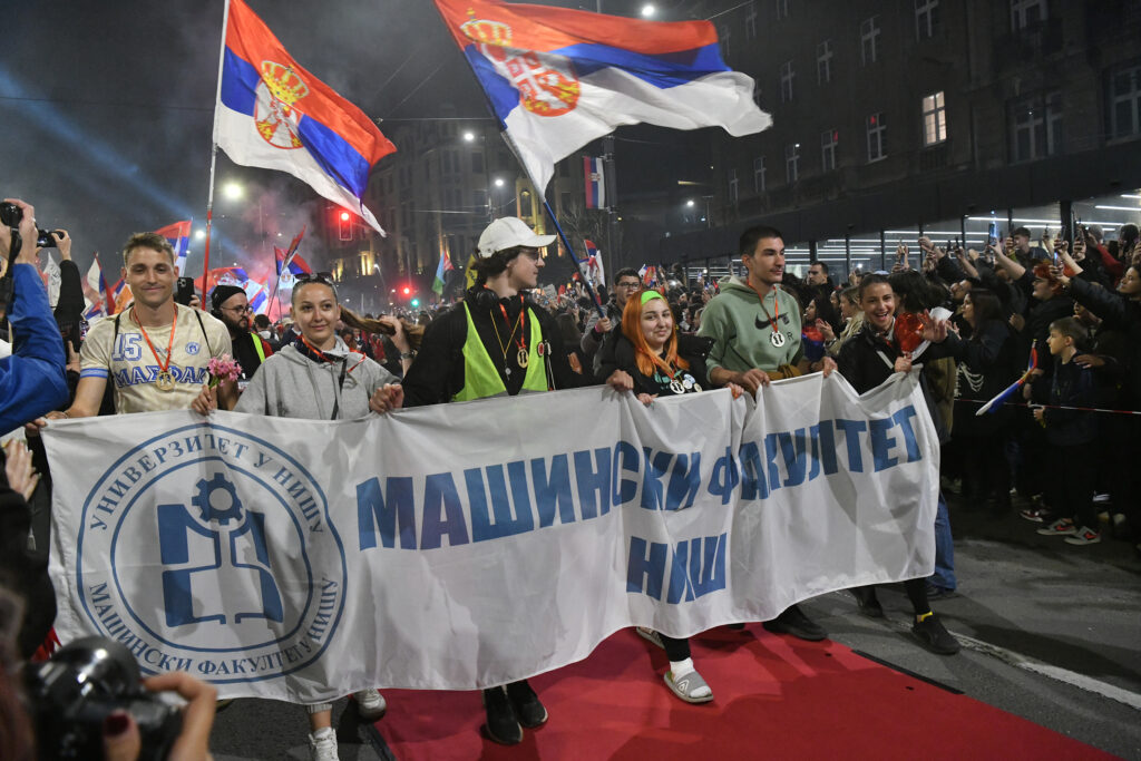 Praćeni ovacijama uz uzvike "Pumpaj, pumpaj" studenti prilaze Palati Albanija, gde će im biti uručene medalje. Na čelu kolone je i transparent: "Dođoše i Nišlije".