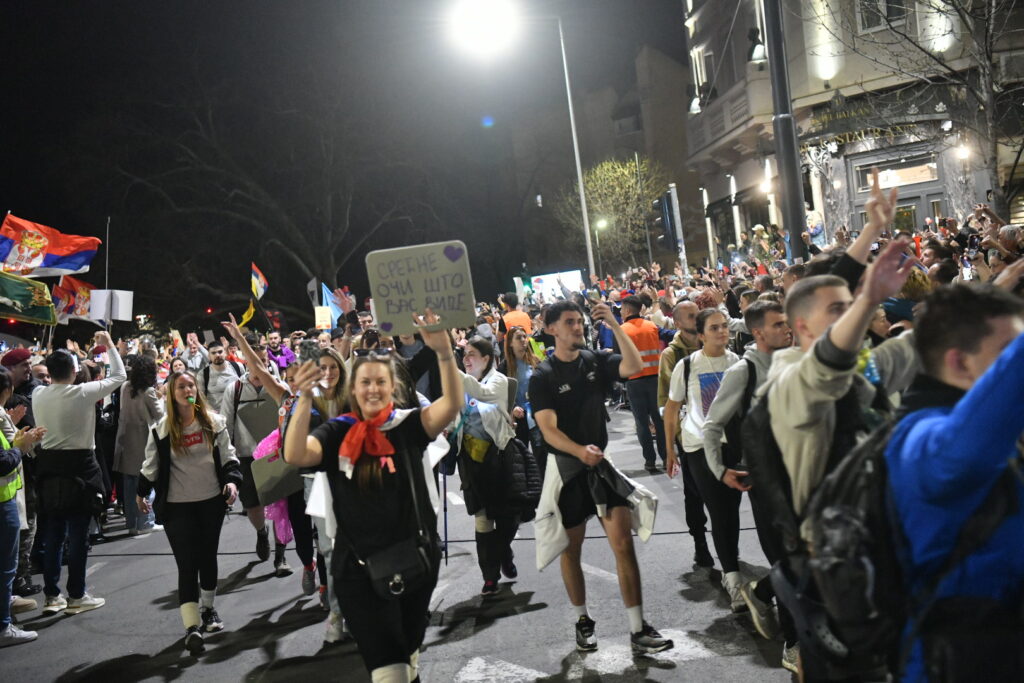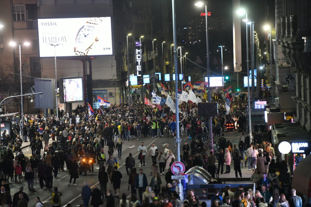 Studenti iz Niša i Vršca trenutno se nalazi na Slaviji i kreću ka Terazijama, a ispred njih je traktor. Građani od Slavije, pa sve do Terazija, dočekuju studente. Neki od njih i plaču. Pušten je i vatromet.