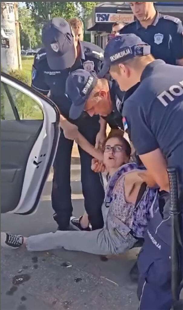 Jutros je na trotoaru pored štanda zbora Fontana uhapšena žena koju su trojica policajaca grubo uvukli u automobil.