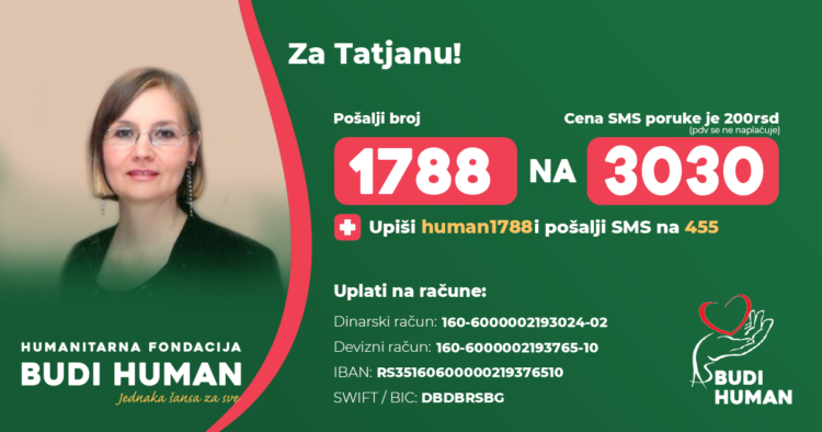 Za kontinuiran nastavak lečenja Tatjani su neophodna značajna finansijska sredstva koja njena porodica više nije u mogućnosti samostalno da obezbedi pa im je potrebna pomoć svih ljudi dobre volje koji su u mogućnosti da joj pomognu.