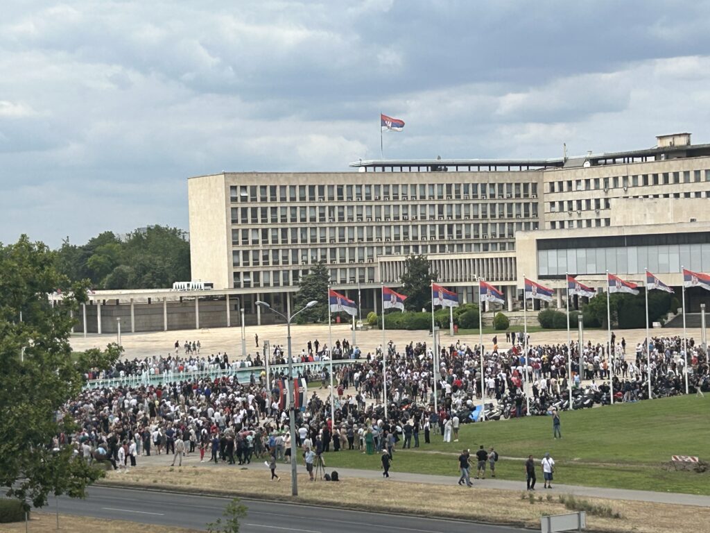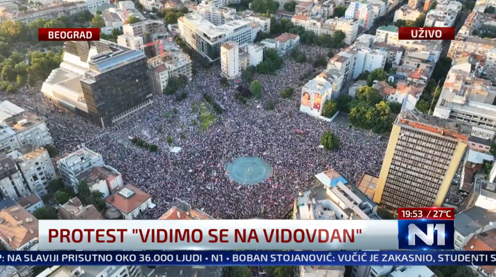 Na Trgu Slavija u Beogradu juče je održan protest pod nazivom "Vidimo se na Vidovdan" koji su organizovali studenti u blokadi. Skup je trajao tri sata, a fokus skupa je bilo ispunjavanje dva zahteva koja su tražili da budu ispuinjeni do 21 sat - raspisivanje vanrednih parlamentarnih izbora i uklanjanje šatorskog naselja u Pionirskom parku.