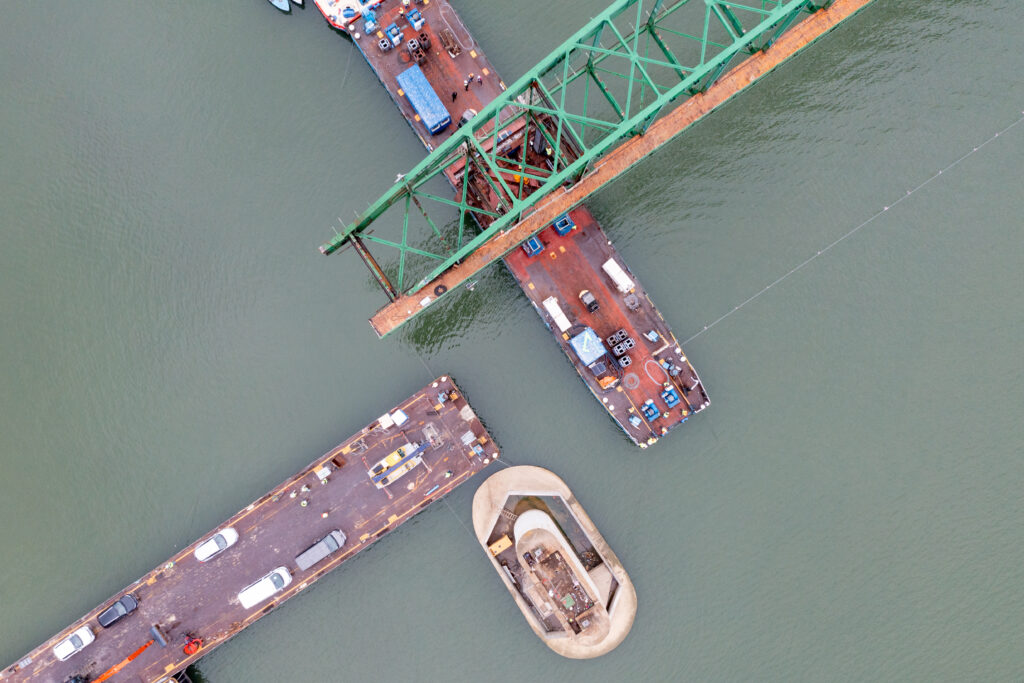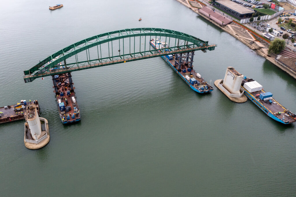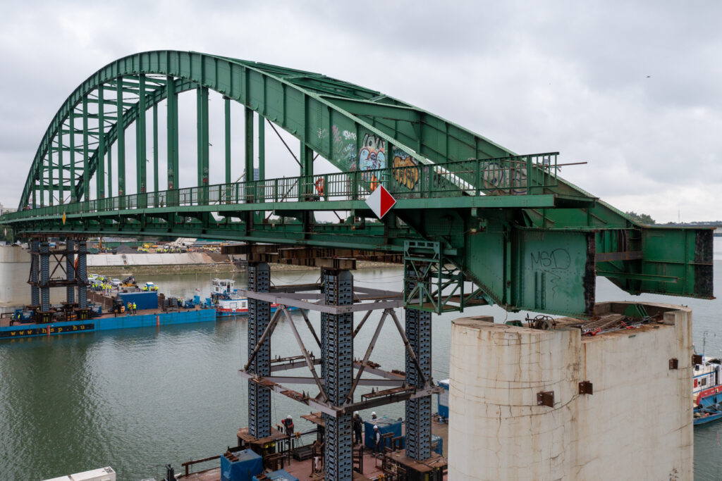 Prepoznatljivi zeleni luk skinut je sa stubova i hidrauličnim dizalicama premešten na barže, kojima bi dalje trebalo da bude sklonjen sa rečnog korita, javio je reporter RSE.
