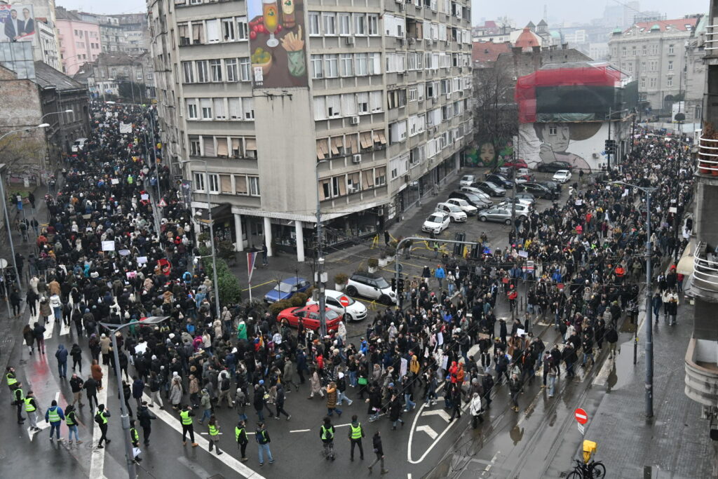 Više hiljada studenata i građana blokiralo je raskrsnicu Nemanjine i Ulice kneza Miloša ispred Vlade Srbije a kolona učesnika protesta prostirala se do raskrsnice Kneza Miloša i Trga Nikole Pašića s jedne, i od raskrsnice Nemanjine do Savskog trga s druge strane.