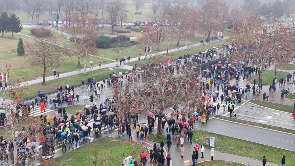 Oni su nosili transparente s imenima poginulih u nesreći na Železničkoj stanici u Novom Sadu kao i parole „RTS proizvodi bes“ i „Vladavina prava za sve“.