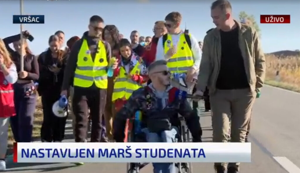 Studenti iz Vršca pešače ka Novom Sadu, a bliže se i prvoj pauzi u Margiti. Sa studentima i srednjoškolcima je krenuo i Ivan, kaže reporter N1, i pored otežavajućih okolnosti, misleći na to što je u kolicima.