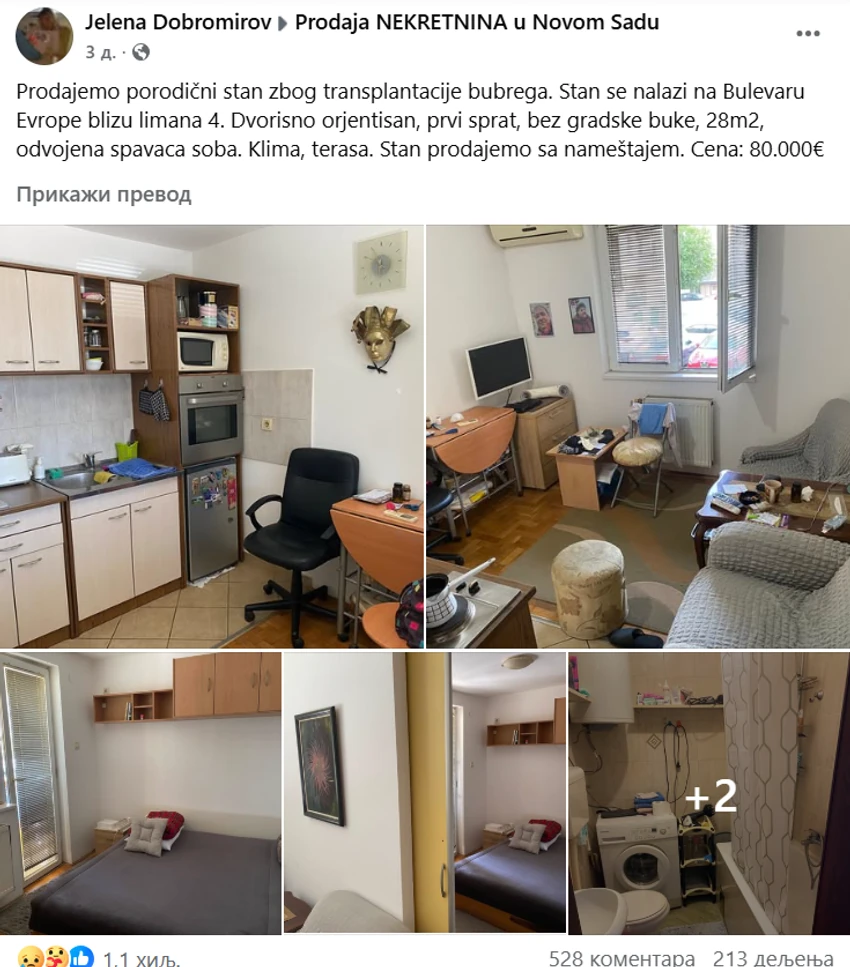 „Sva sreća, nisam još uvek prodala stan. Nedavno je zgrada legalizovana, a Katastar kasni sa upisom nekretnina, tako da je prodaja moguća samo za keš. Oglasila sam ga na 80.000 evra, mnogima je to, čini mi se, veliki zalogaj. Međutim, iako mi je novac preko potreban, ne mogu da ga prodam tek tako, za džabe. To je naš porodični stan i nije mi bilo lako što sam ga stavila na oglas, ali izbora nemam“; priča za Nova.rs Jelena.