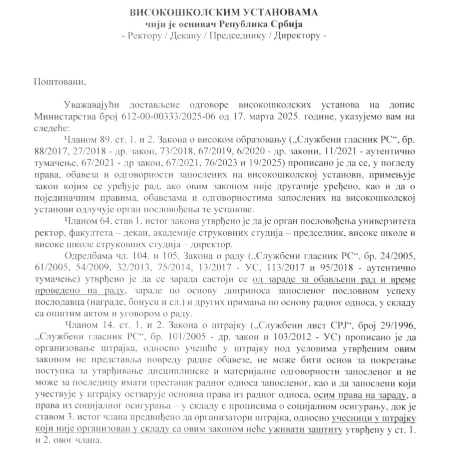Sada je Ministarstvo otišlo korak dalje i uputilo novi dopis na adrese svih visokoškolskih ustanova u Srbiji, a u kom im, prema rečima sagovornika Nova.rs, otvoreno preti otkazima i disciplinskim prijavama.