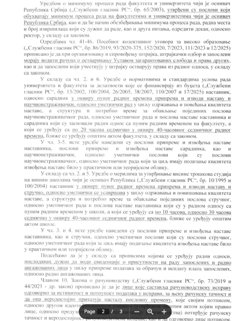 „Naravno, ima onih fakulteta na kojima ponešto radi, ali to je retkost. Apsurdno je razmišljati o tome da dekan treba da vodi evidenciju dolazaka na posao. To je tačno, naravno, ali za Ministarstvo kao da ne postoje ova četiri meseca koliko traju blokade. Sve što dopis sadrži, sadrži u odnosu na ono što se citira u Zakonu o štrajku. Znam da su tri-četiri fakulteta u štrajku, sve sam savetovao da ne idu u štrajk baš zbog te Uredbe iz 2023. Ali ne možete svim fakultetima da naglasite šta se dešava kada ste u štrajku, a kad nisu u štrajku. Njih poistovećuju sa štrajkom, iako to nije štrajk“, smatra Reljanović.