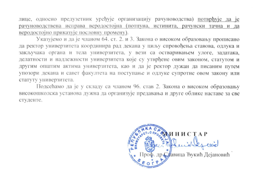 Ministarka prosvete Slavica Đukić Dejanović uputila je pre dva dana hitan dopis svim fakultetima u Srbiji, u kom od rektora, dekana, predsednika i direktora (svi su pobrojani u dopisu) zahteva da obaveste Ministarstvo o tome da li se na njihovim fakultetima izvode predavanja i drugi oblici nastave.