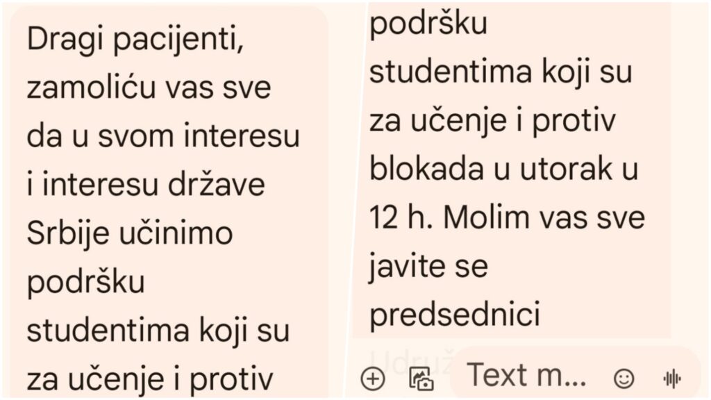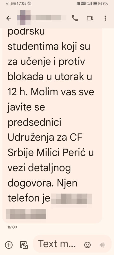 “Dragi pacijenti, zamoliću vas sve da u svom intresu i u interesu države Srbije učinimo podršku studentima koji su za učenje i protiv blokada u utorak u 12 h. Molim vas sve da se javite predsednici Udruženja za CF Srbije Milici Perić u vezi detaljnog dogovora”, piše u poruci u koju je N1 imao uvid. Uz to se navodi i broj telefona predsednice Udruženja CF Srbija.
