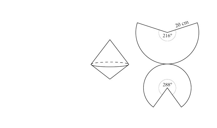 Telo se sastoji od dve prave kupe sa zajedničkom osnovom, pri čemu se vrhovi nalaze sa raznih strana osnove. Izračunaj zapreminu ovog tela koristeći podatke prikazane na njegovoj mreži. Prikaži postupak.