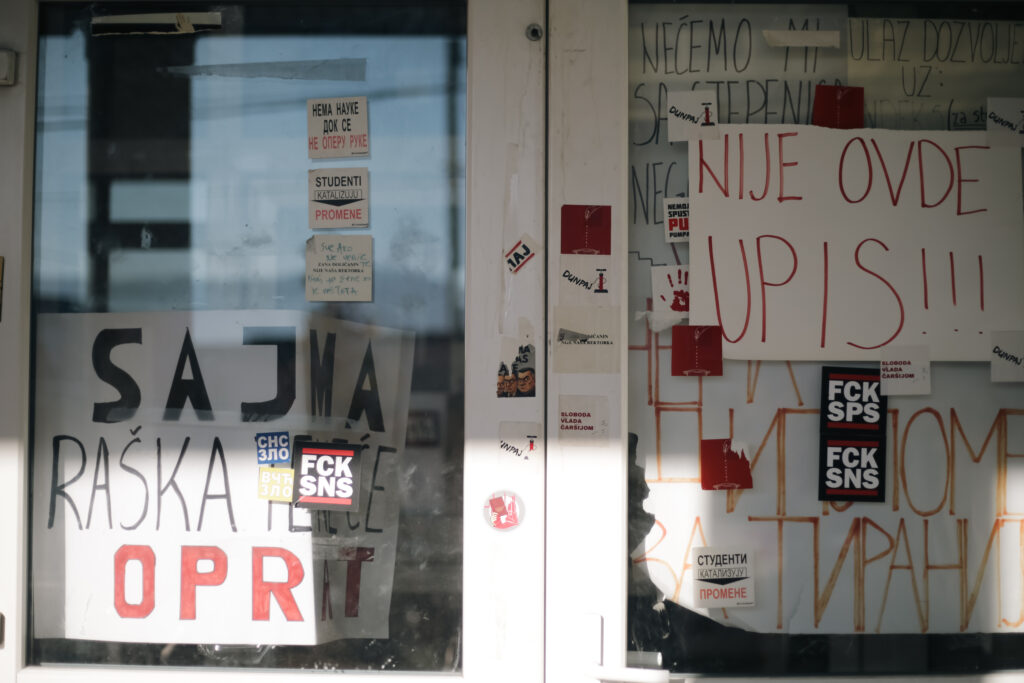 „DUNP je, kao što i sami vidite, i dalje u totalnoj blokadi. Nema portira na ulaznim vratima, nema nikoga u pisarnici, studentskoj službi, nema Uprave. Samo smo mi tu. Blokada je bila prekinuta onda kada su izvršili nasilni upad i to je trajalo nekih 13-14 sati. Posle smo ponovo blokirali i od tada ne popuštamo“, priča nam Kenan dok nas uvodi unutra.