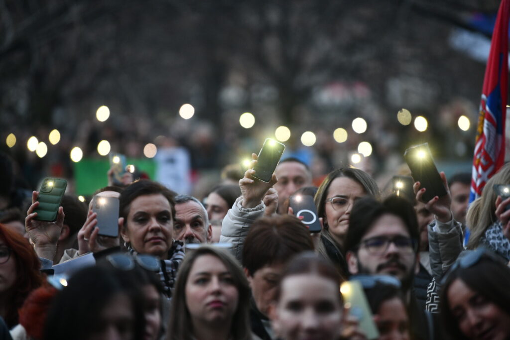 Okupljeni su upalili bliceve na svojim mobilnim telefonima i počela je petnaestominutna tišina ispred Ministarstva prosvete.