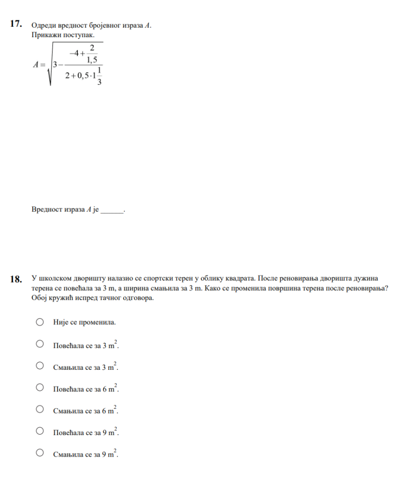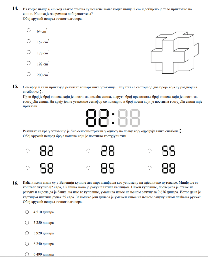Mali maturanti danas su polagali drugi deo prijemnog ispita - test iz matematike, dok su juče radili srpski jezik. Za sutra je predviđen test iz izbornog predmeta, čime se prijemni ispit za upis u srednju školu završava. Ministarstvo prosvete objavilo je rešenja današnjeg testa iz matematike, a u nastavku teksta pogledajte kako je on izgledao.