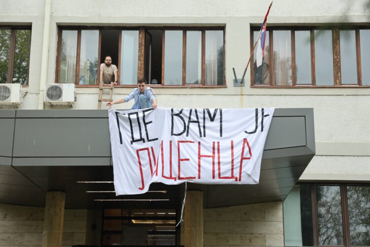 Dok sa razglasa, sa koga se obično čuje: „Pumpaj“, mladom paru pružaju muzičku podršku, brinu posle četvrte provedene noći u zgradi Rektorata koju su „zauzeli“ u sredu, o budućnosti svojih blokada i studentske borbe.