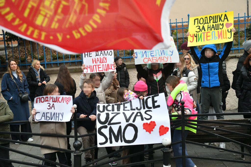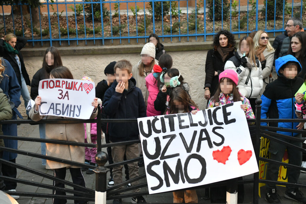 Podsetimo, ispred OOŠ „Vladislav Ribnikar“ u Ulici Svetozara Markovića u Beogradu juče je održan skup podrške učiteljici Sabini Gicić, koji su organizovali učenici odeljenja IV-3, zbog pokretanja disciplinskog postupka protiv učiteljice.