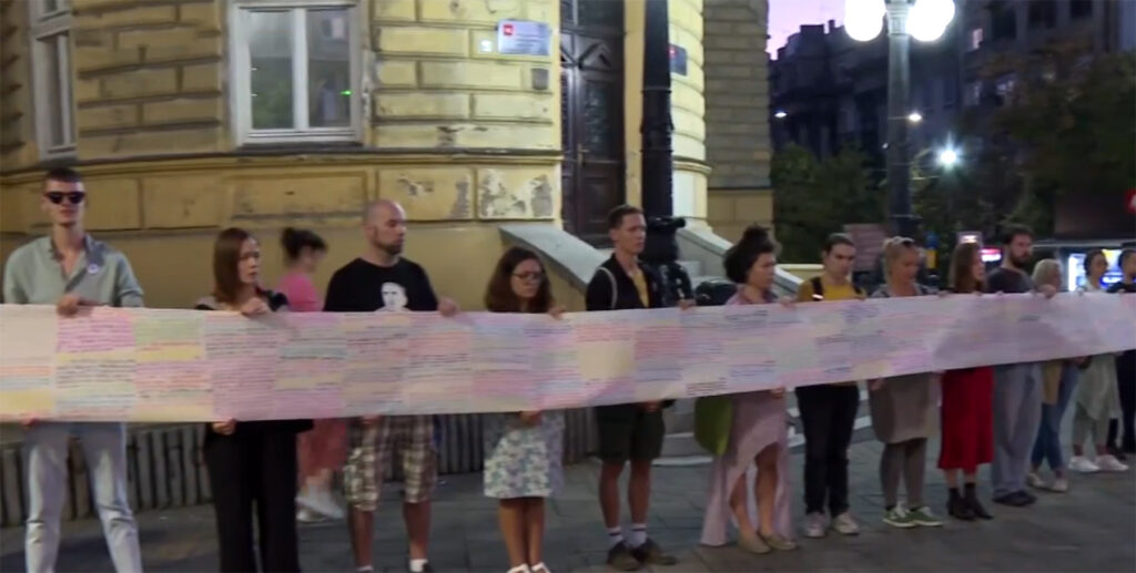 Kako javlja reporterka N1, ispred SKC se iščitavaju izjave koje su davali učesnici tog skupa. Cedulja je dugačka oko 30 metara, a ispisano je oko 800 izjava onih koji su 15. marta bili na protestu.