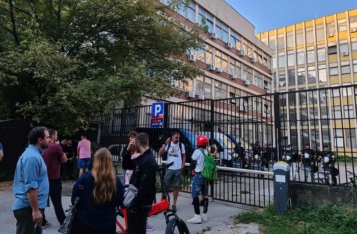 Policija je prisutna u zgradi i iza ograde na zadnjem ulazu.