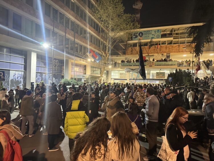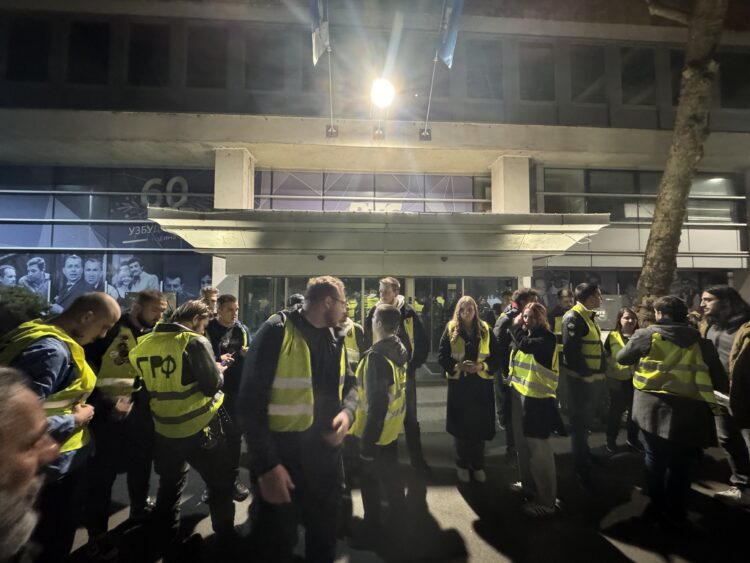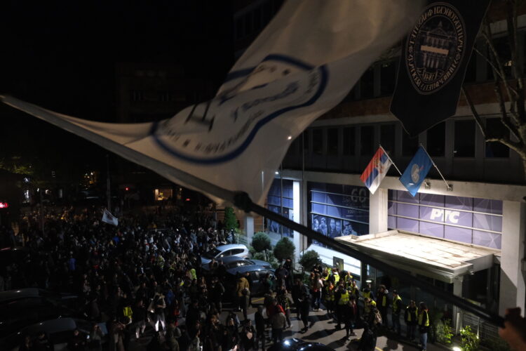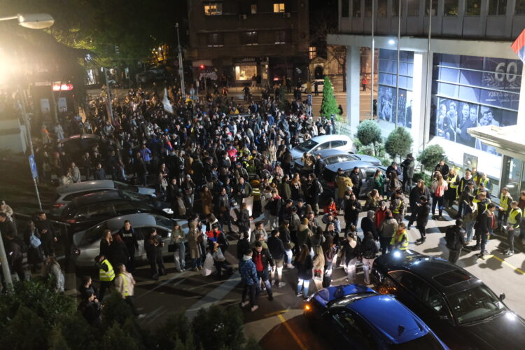 „Nemojte da lažete“ i „ko ne skače, taj je ćaci“ orilo se na protestu ispred javnog servisa gde se okupio veliki broj studenata i građana.