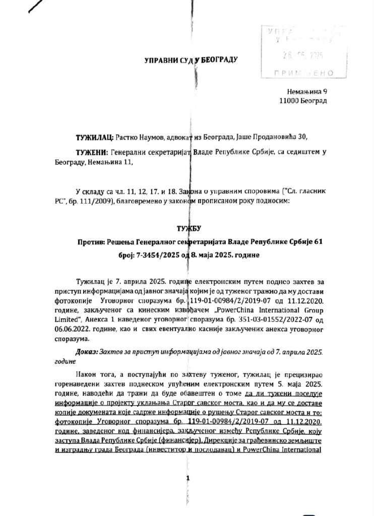 Inicijativa "Beograd ostaje" pokrenula je upravni spor protiv Vlade Republike Srbije zbog neosnovanog skrivanja od javnosti, Ugovora o rušenju Starog savskog mosta i izgradnji novog mosta, koji su potpisali Vlada RS i Direkcija za građevinsko zemljište i izgradnju grada Beograda (sa jedne strane) i kineska kompanija Powerchina (sa druge strane).