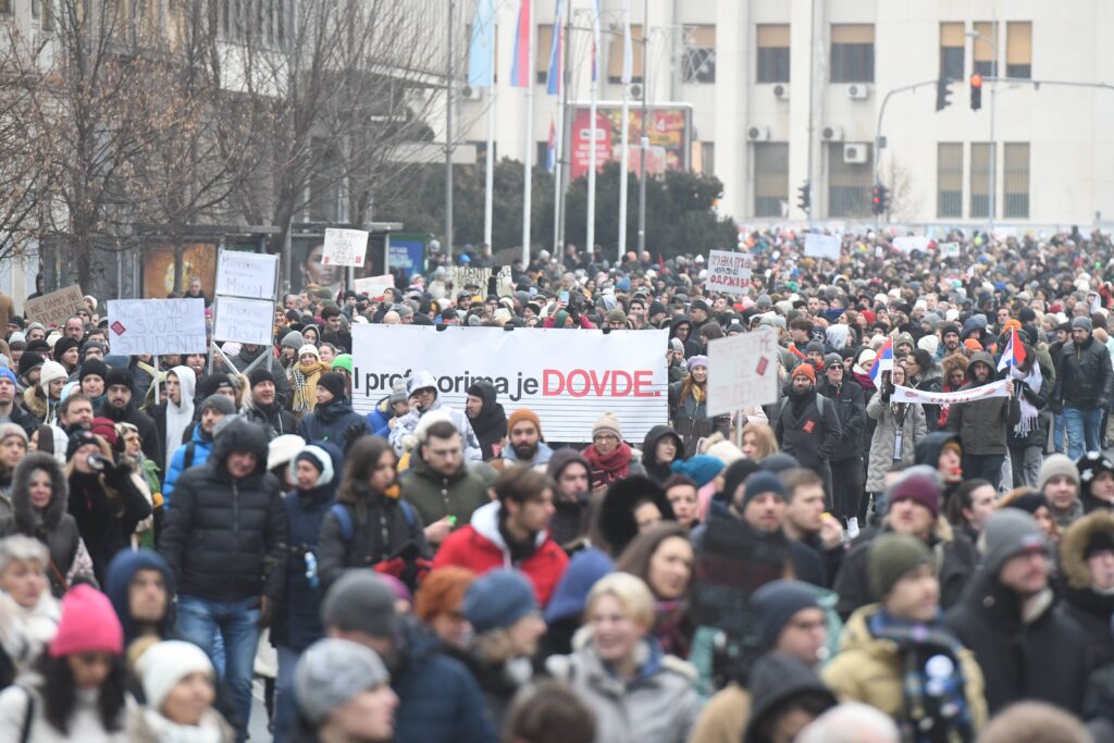 U 11.52 odata je pošta poginulima na novosadskoj Železničkoj stanici 1. novembra, a ljudi su nosili transparente: „Sve mora da stane“, „Generalni štrajk“, „Obećali ste život, doneli ste smrt“, „Studenti naše svetlo u mraku“, „Pravna država mora da se održava“, „Profesori uz studente“, „Novi slobodan univerzitet sad“ i „Profesori polažu ispit ispred studenata“.