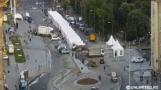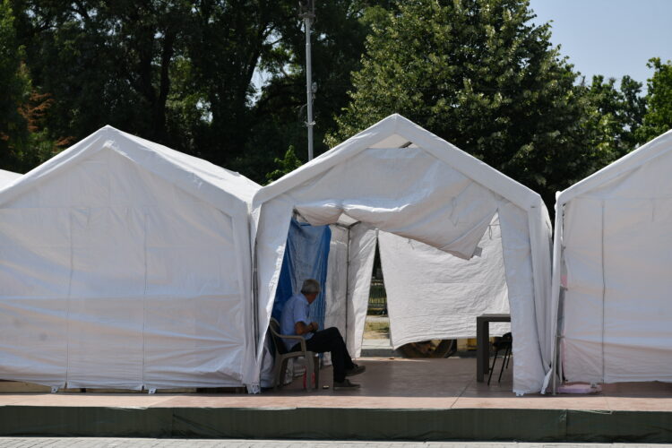 Vide se radnici koji pripremaju posuđe za spremanje hrane i roštiljanje, a između šatora su postavljene i stolice i suncobrani, pretpostavlja se za doček građana na književno veče.
