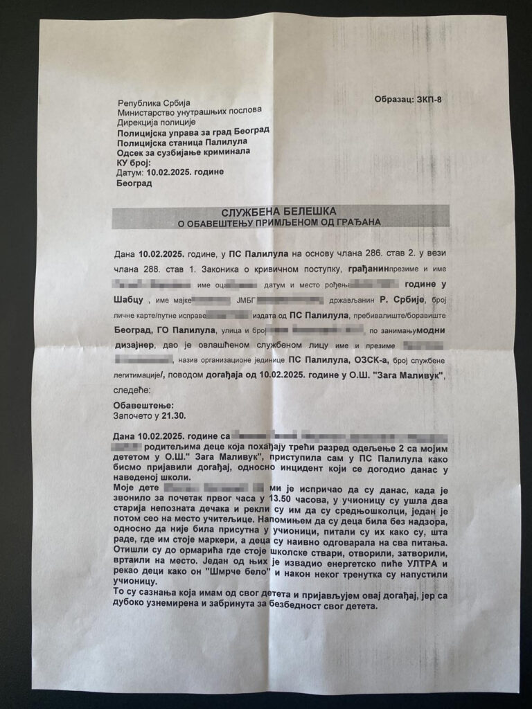„Ispitivali su decu, neka banalna pitanja im postavljali, a deca su iskreno odgovarala jer su mala i bila su uplašena. Deca nisu znala ko su ta dvojica i jesu li oni uopšte đaci te škole. Ta dvojica su pila energetska pića i pričala deci da koriste kokain – da smrču belo… Oni su tu sedeli, brljali po ormanu učiteljice, radili su šta su hteli jedno petnestak minuta i sami su otišli. Pošto su deca mala, mi ne znamo tačno ni šta su sve govorili i šta su ih ispitivali jer oni možda i nisu sve razumeli, ali su definitivno bili preplašeni“, kaže majka učenika tog odeljenja.
