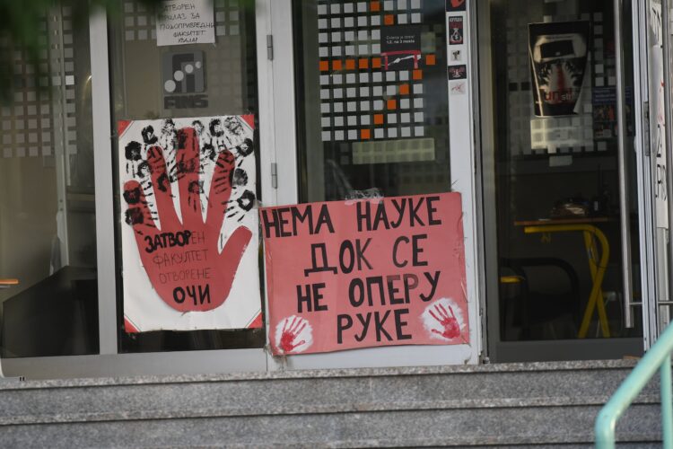 Ispred zgrade suda nalazila se grupa studenata u blokadi Novosadskog univerziteta, koji su mu pružali podršku i zahtevali da bude pušten da se brani sa slobode.