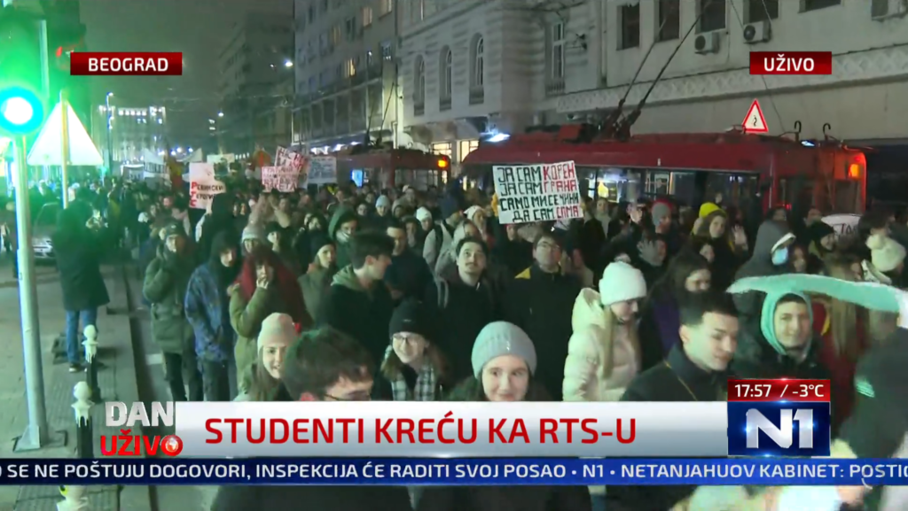 Reporter je objasnio da studenti protestuju ispred RTS, jer su nezadovoljni izveštavanjem sa Javnog servisa.