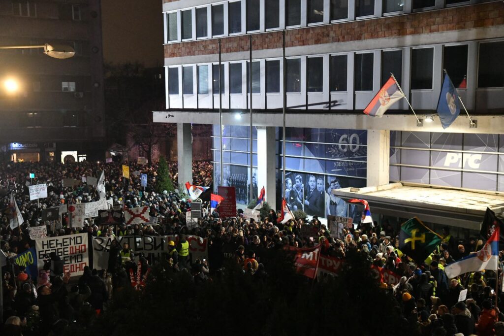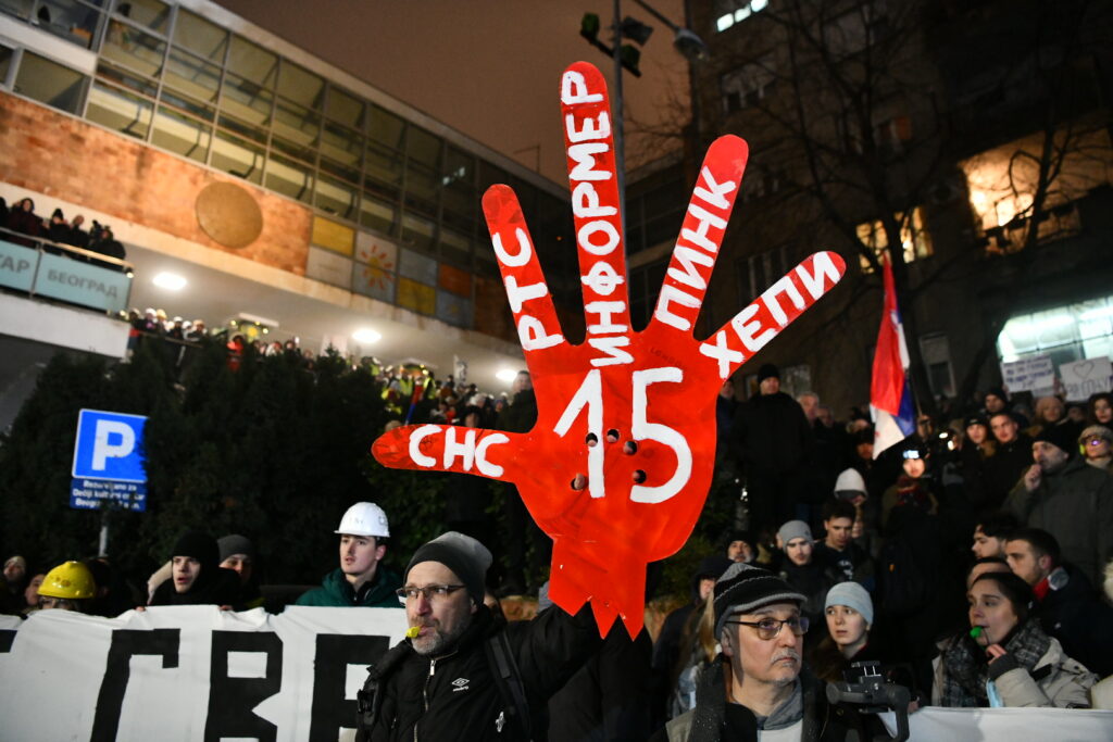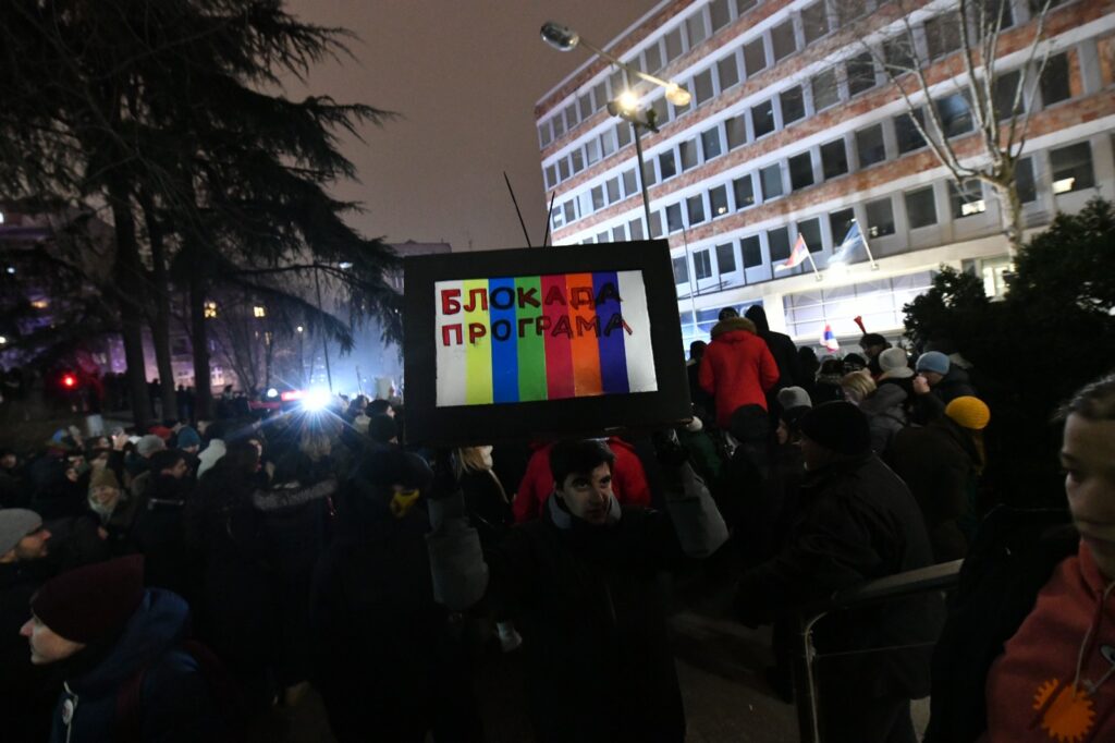 "Ja sam ovde jer je ovo mesto svima nama… Izveštavanje RTS-a je užasno. To moramo da promenimo, možda još večeras”, kazao je jedan učesnik protesta.