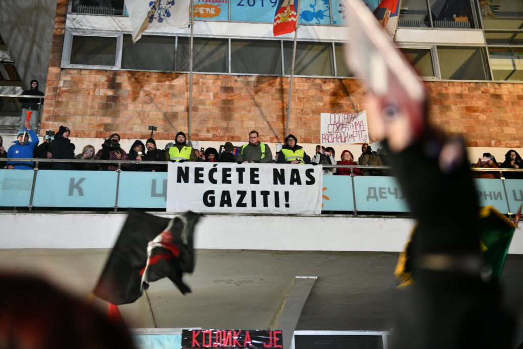 Sa zgrade RTS razvijen je transparent „Radnici RTS su uz studente“,a okupljeni su uzvratili skandiranjem „Hvala na podršci“.