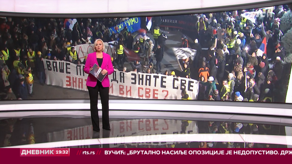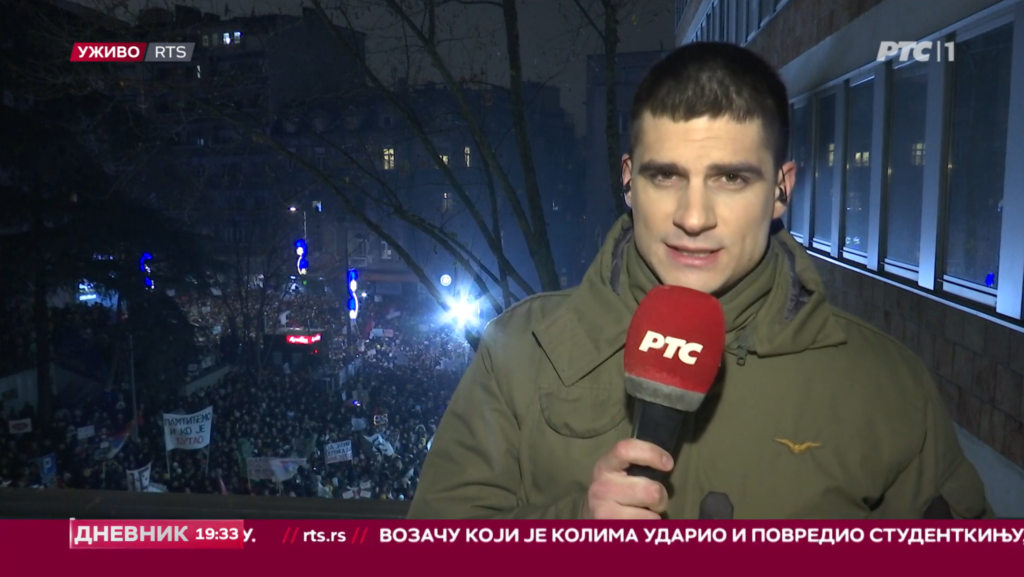 U Drugom dnevniku RTS nakon prve vesti o zdravstvenom stanju povređene devojke, njihov reporter se uključio da izveštava direktno sa protesta,k piše Danas.