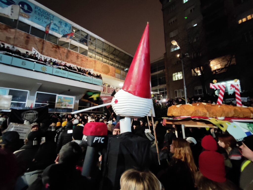Studenti su doneli veliku maketu sendviča koji je namenjen kao poklon direktoru RTS Draganu Bujoševiću.