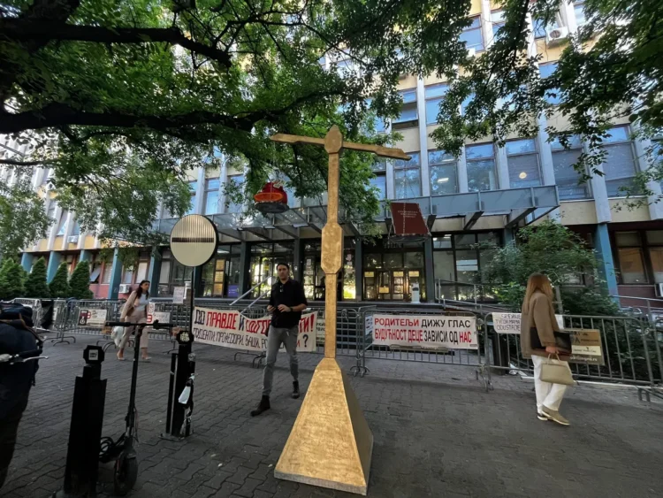 Studenti sa Akademije umetnosti uoči protesta “Naša Ana zaslužuje pravdu” postavili su uoči početka ročišta o ovom slučaju maketu vage ispred zgrade suda.