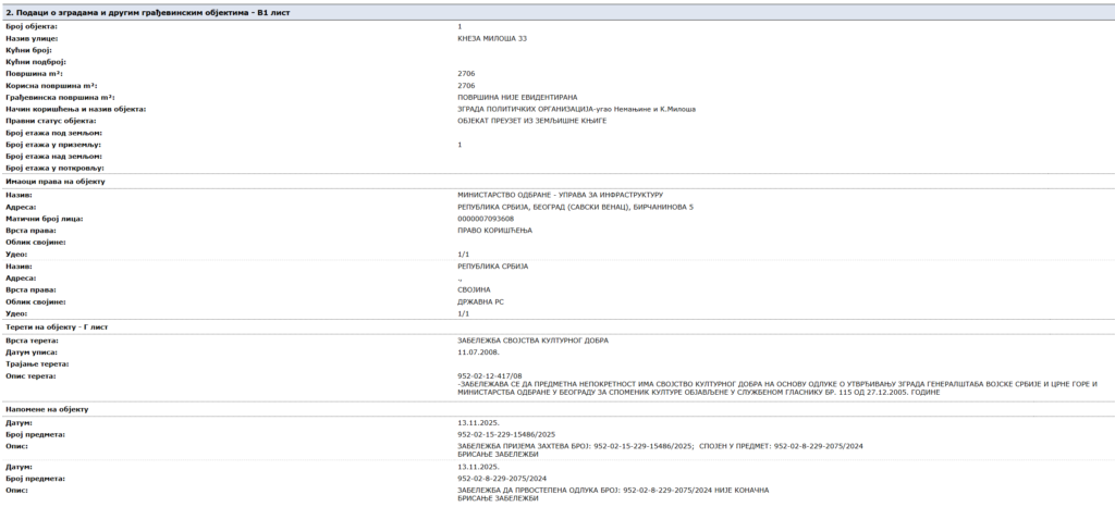 Kada je reč o parceli 969/1 i objekatu koji se nalazi na njoj, prva zabeležba stavljena je 11. jula 2008. U njoj piše da predmetna nepokretnost ima svojstvo kulturnog dobra na osnovu odluke o utvrđivanju zgrada Generalštaba Vojske Srbije i Crne Gore i Ministarstva odbrane u Beogradu za spomenik kulture, te da je to objavljeno u Službenom glasniku 27. decembra 2005.