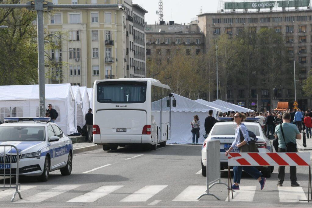 Oko tih šatora je jutros posle 6 sati bilo više desetina policajaca, a saobraćaj na Trgu Nikole Pašića i dalje je blokiran, javlja reporter agencije Beta.