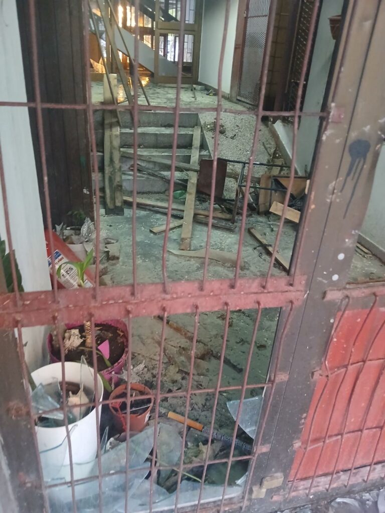 Ulazna vrata na zgradi u kojoj žive stanari su potpuno uništena, dok je razbijeno staklo svuda okolo.
