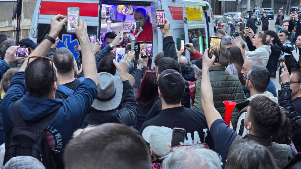 „Samo mirno bez incidenata, traže neke biber sprejeve kako bi hapsili i druge ljude“, rekao je kratko Nemanja Šarović pre nego što je ušao u vozilo Hitne pomoći.