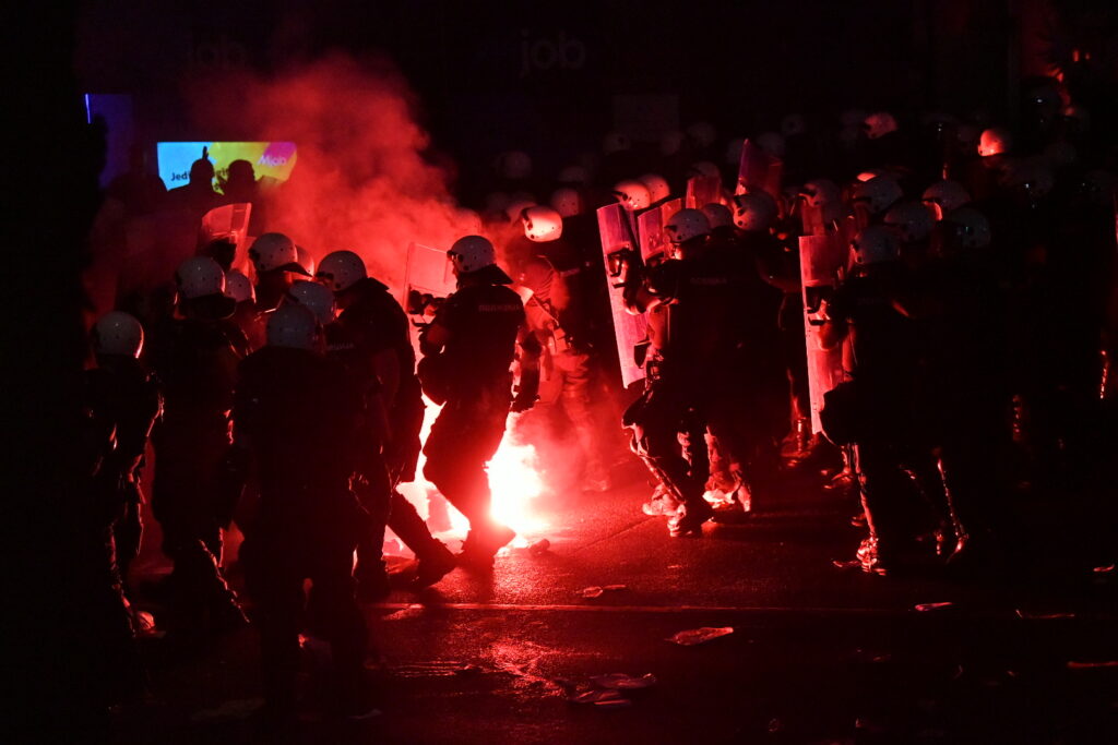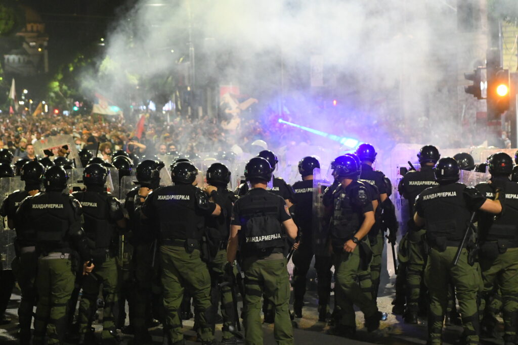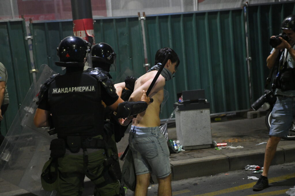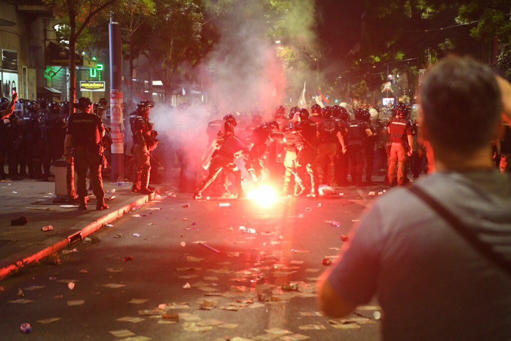 U Bulevaru kralja Aleksandra situacija je eskalirala. Vide se upaljene baklje, policija potiskuje demonstrante i hapsi ih. Čuju se topovski udari.