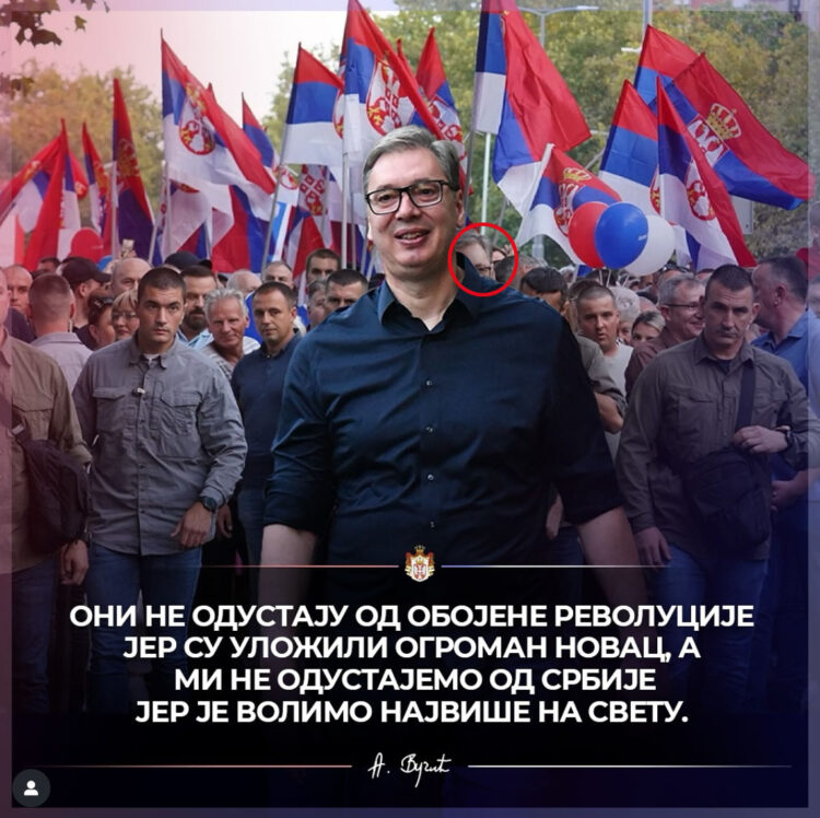 „Oni ne odustaju od obojene revolucije jer su uložili ogroman novac, a mi ne odustajemo od Srbije jer je volimo najviše na svetu“, navedeno je na spornoj fotografiji uz potpis Aleksandra Vučića.