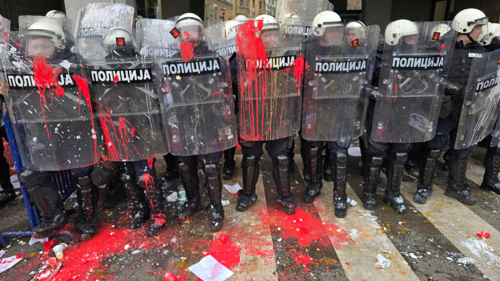 Policija je bila polivena crvenom farbom, a zatim su građani na njih bacali jaja, tetrapake jogurta, farbu, toalet papir, čak i brašno. U više navrata policija je uzvratila, gađajući građane ostacima.
