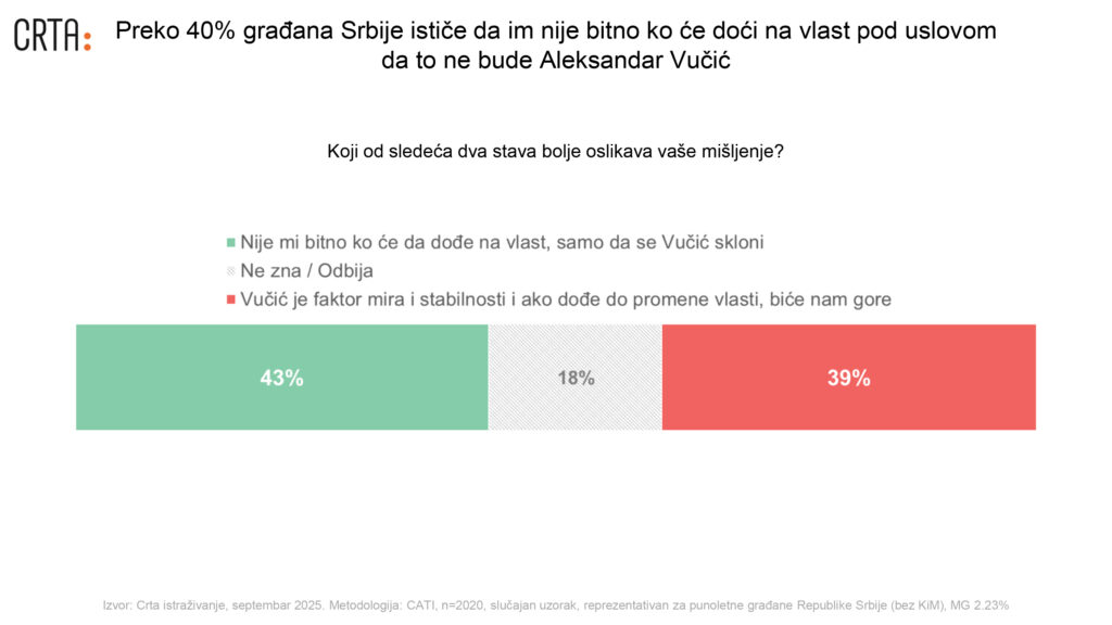 Prema istim nalazima, čak 43 odsto građana kaže da nije bitno ko će umesto Aleksandra Vučića doći na vlast, dok 39 odsto njih misli da bi u Srbiji bez njega bilo gore.