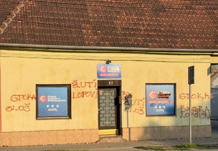 Noćas su prostorije Stranke slobode i pravde u Bačkom Petrovcu išarane uvredljivim grafitima. Iza tih grafita stoje isti ljudi koji su pre samo dva dana predvodili grupu batinaša, cepali izložbu građana i napali ih na manifestaciji Slovačke narodne igre” izjavila je Martina Martinko Sabolčki iz Stranke slobode i pravde Bački Petrovac.